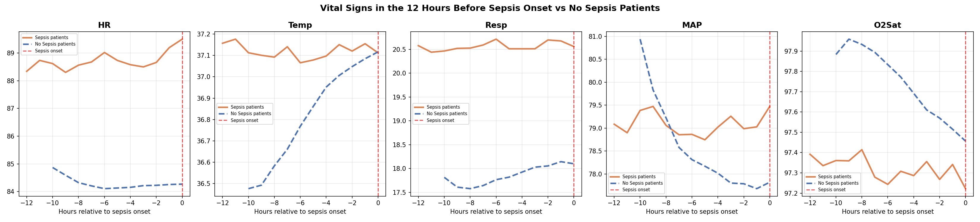 Before modeling, the EDA revealed something critical. When I aligned all sepsis patients to their onset time and looked at the 12 hours before the label flipped, their vitals were already diverging from non-sepsis patients — from the very beginning of the window.